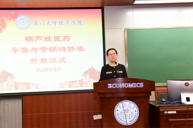 刘景萍董事长代表葫芦娃药业集团对厦门大学各级领导、老师对葫芦娃的大力支持表示感谢,并对研修班学员做动员讲话。她希望参加培训的学员珍惜来之不易的学习提升机会,沉下心来“加油充电”,结合工作实践,用心学习认真领悟,真正做到学有所获、学以致用。她说,厦大拥有着深厚的人文底蕴和优质的教育资源,在东南亚国家和地区具有广泛的影响力,在“一带一路”这一国家战略背景下,医药营销人员应该具备更为广阔的国际视野和更为丰富的知识储备,希望学员们能在本期研修班中学有所成,并以此为新的起点,以奋发的姿态投入到今后的学习和工作中去,不断取得新的进步和业绩,为医药产业和葫芦娃事业的发展做出新的更大贡献。