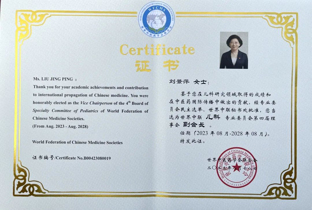 葫芦娃药业集团党委书记、董事长刘景萍当选世界中医药学会联合会儿科专业委员会第四届理事会副会长
